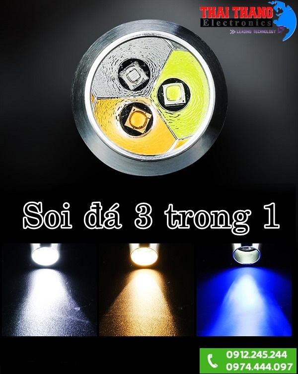- Tích hợp 3 bóng led trong 1 gồm sáng trắng, vàng và tím UV