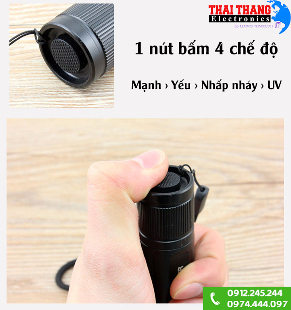 Các chế độ sáng: High - Mid - Low - Strobe (ấn 2 lần nút bấm sẽ kích hoạt chế độ nhấp nháy strobe)
