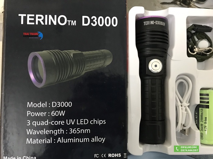 Đèn pin cực tím UV Terino D3000 Được trang bị 3 chip led UV lõi tứ có bước sóng 365nm, cho công suất tối đa đến 60W,phù hợp cho các công việc như kiểm tra mực ẩn,giấy tờ tiền giả, tem rượu, đồ cổ, đá quý, làm khô nhanh các loại keo dán công nghiệp, phát hiện chất thải động vật, các loại côn trùng độc, chất huỳnh quang có trong sữa, mỹ phẩm, tã giấy,diệt khuẩn, kiểm tra vết bẩn mà mắt thường không thể nhìn thấy,….