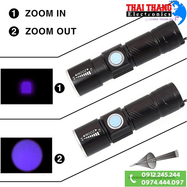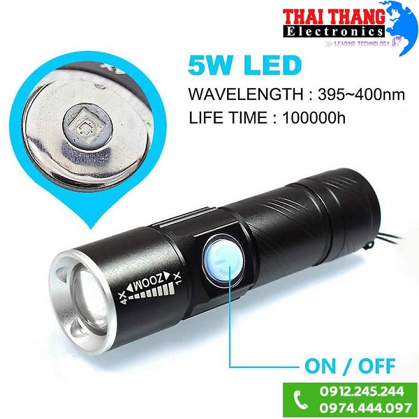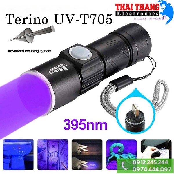 Đèn pin UV Terino UV-T705 sở hửu kiểu dáng nhỏ gọn, thiết kế Zoom điều chỉnh chùm tia phát ra, bước sóng 395nm phù hợp cho nhiều hoạt động soi chiếu như kiểm tra giấy tờ giả, tiền giả, đồ cổ; phát hiện chất photpho trong tả sữa, mỹ phẩm; phát hiện chất thải động vật, soi côn trùng, làm khô nhanh keo dán hoặc khô nhanh sơn móng tay,….