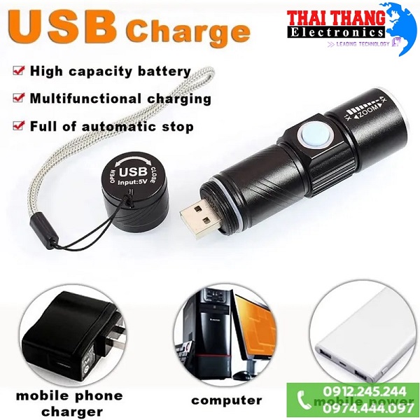Đèn pin siêu sáng UltraFire AT-8099 zoom xoay độc đáo, vỏ hợp kim nhôm siêu bền. Sạc trực tiếp trên thân đèn, có thể sạc trên ô tô bằng sạc tẩu thuốc đi kèm bộ sản phẩm.