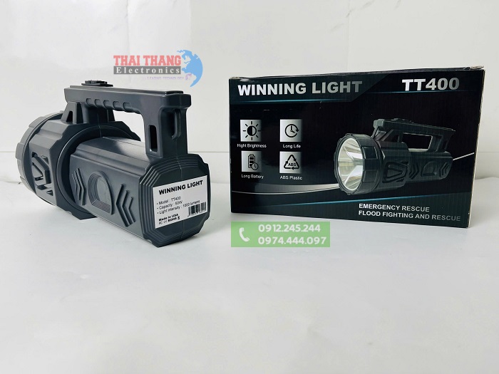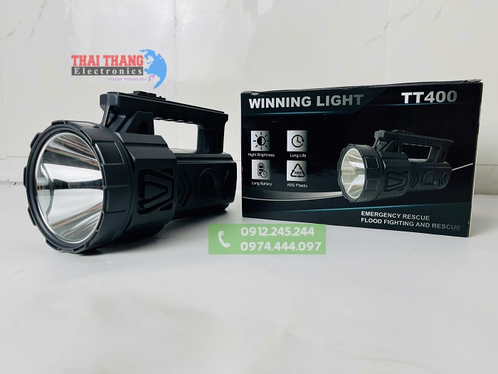 Đèn pin xách tay siêu sáng Winning Light TT400 Được thiết kế với đầy đủ tính năng ưu việt và hiện đại,pin sạc dung lượng cao, chip led thế hệ mới cho cường độ sáng mạnh,kiểu dáng gọn nhẹ,…. Sản phẩm thích hợp cho các hoạt động ngoài trời yêu cầu khoảng cách soi xa như tuần tra, an ninh, quân sự, cứu hộ,cứu nạn, khám phá hang động, hàng hải, trang trại, sửa chữa máy,chiếu sáng cá nhân….