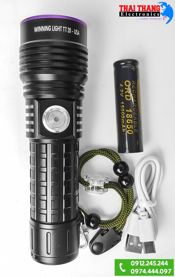 Đèn UV cực tím đa năng Winning Light TT20 USA Sử dụng nguồn là pin sạc 18650 cho thời gian sử dụng từ 3 đến 5h tùy chế độ sáng,đèn trang bị thêm đèn báo dung lượng pin trên công tắc giúp người dùng chủ động trong việc sử dụng, đèn này còn đóng vai trò là đèn báo quá trình sạc,thân vỏ sử dụng chất liệu hợp kim nhôm AL6061T6 siêu nhẹ, độ bền cao, lớp ngoài phủ Anodize cấp độ III chống oxy hóa. Đầu đèn được tiện CNC các rãnh tản nhiệt, giúp đèn sử dụng lâu mà không bị nóng,khả năng chống thấm nước giúp đèn hoạt động tốt ở những môi trường khắc nghiệt nhất.