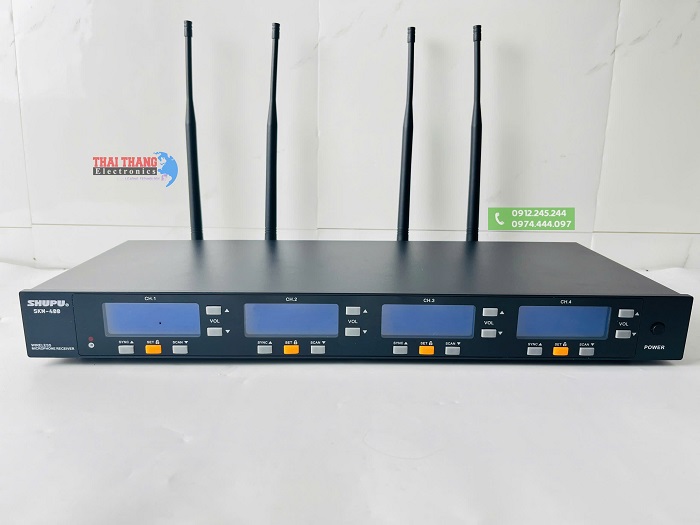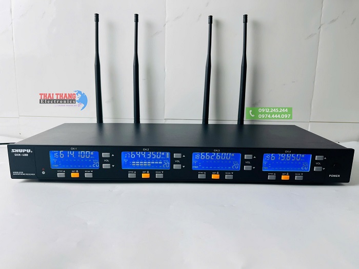 Micro hội nghị không dây chuyên nghiệp Shupu SKM400 Bộ trung tâm thu tín hiệu có màn hình hiển thị thông tin tần số kết nối cho cả 4 mic,điều chỉnh kênh,tần số riêng biệt đảm bảo tín hiệu kết nối với amply hay các thiết bị âm thanh khác được tốt nhất.