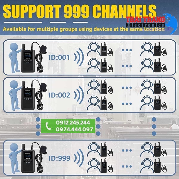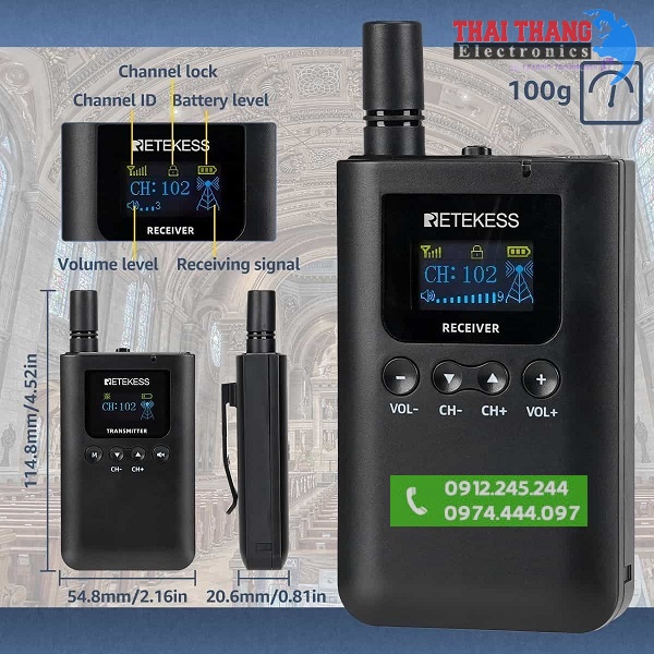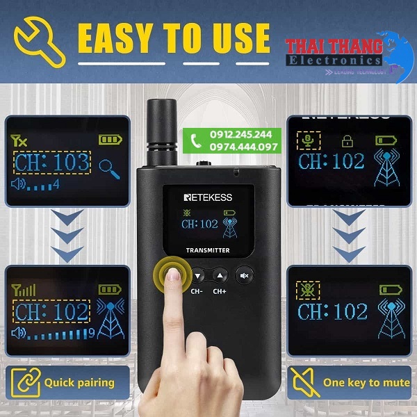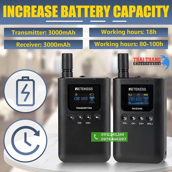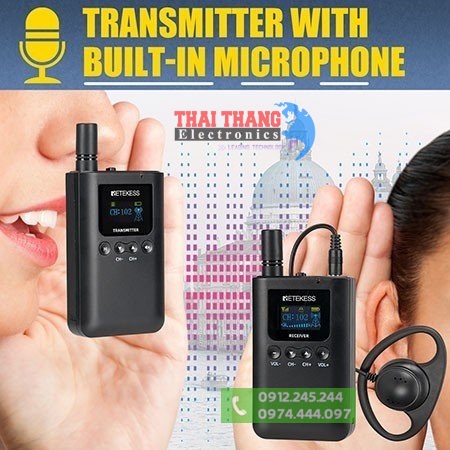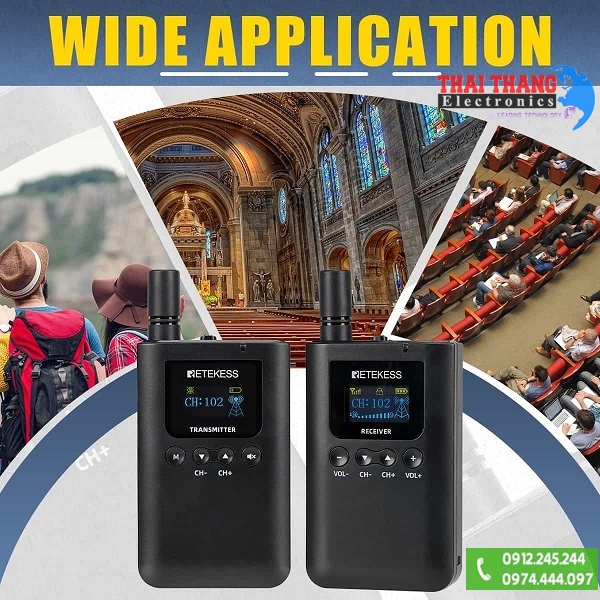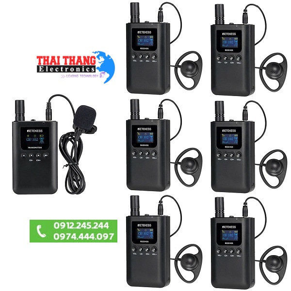 Micro không dây dẫn đoàn RETEKESS-TTI 1250 Là dòng micro không dây dẫn đoàn cho hướng dẫn viên du lich,bộ phận tiếp nhận chính phủ,bộ phận phiên dịch,thông dịch viên,sử dụng trong các nhà máy,công xưởng, Máy chủ trang bị cho đội trưởng,trưởng đoàn người phụ trách đàm thoại,khách/thành viên đeo máy phát này có thể nghe rõ khoảng cách xa từ 100-150 và không giới hạn số lượng người nghe,có thể chia thành các nhóm khác nhau tại cùng một địa điểm và không can thiệp lẫn nhau.