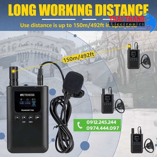 Phạm vi truyền tải tín hiệu lên tới 100-150m nên máy thu không cần phải ở gần máy phát,điều này cho phép người tham gia đi lại tự do mà vẫn nghe được thông tin hữu ích được truyền đi với chất lượng âm thanh cao,bộ phát có khả năng giảm tiếng ồn xung quanh,mang lại âm thanh đầu ra đã qua xử lý có thể đạt hiệu ứng 16K đảm bảo rằng âm thanh được truyền đi rõ ràng và dễ hiểu đối với người nghe.