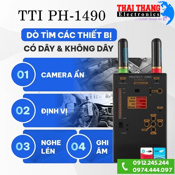 Máy phát hiện nghe trộm TTI KOREA TTI-PH1490 Phát hiện nghe lén,ghi âm và chống quay lén hiệu quả: TTI-PH1490 có khả năng dò tìm các thiết bị nghe lén, định vị GPS, camera giấu kín camera siêu nhỏ, camera không hồng ngoại một cách nhanh chóng và chính xác,thiết bị phân tích tín hiệu thông minh, giúp người dùng phát hiện nhanh chóng các thiết bị không mong muốn đặt trong khu vực nhà,văn phòng,hay phương tiện di chuyển…