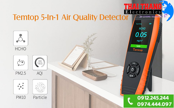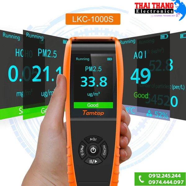 Máy đo khí đa chỉ tiêu chính hãng Temtop LKC-1000S Sử dụng cảm biến hạt laser và cảm biến aldehyd dạng điện hóa xác định được các loại bụi thông thường, bụi mịn PM2.5 và PM10 với phạm vi đo từ 0-999µg/m³, các loại khí độc hại như HCHO (Formaldehyde) phạm vi đo 0-2mg/m³, hiển thị AQI (chỉ số chất lượng không khí), nhiệt độ, độ ẩm,….