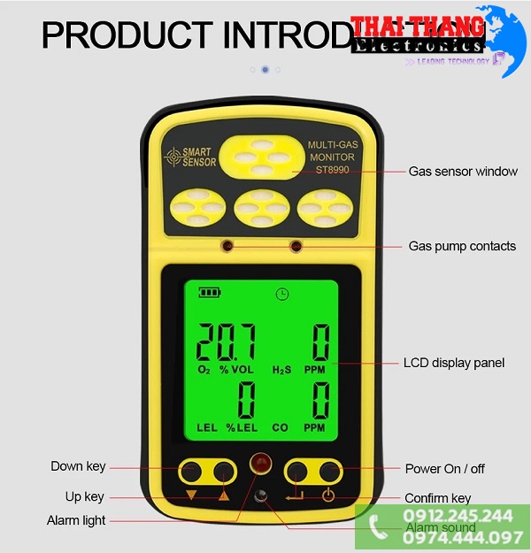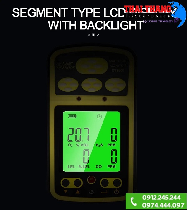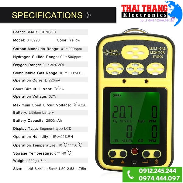Máy đo khí đa chỉ tiêu SmartSensor ST8990 Dải đo khí O2 từ 0 đến 30%VOL, khí CO từ 0 đến 999PPM, khí H2S 0 đến 500PPM và dải đo của khí dễ cháy nổ LEL từ 0 đến 100%; các dải đo rộng giúp sản phẩm sử dụng trong nhiều môi trường khác nhau. Sản phẩm sử dụng linh kiện chất lượng cùng cảm biến chính hãng Đức cho độ nhạy khí, độ chính xác cao và thời gian trả kết qua nhanh.
