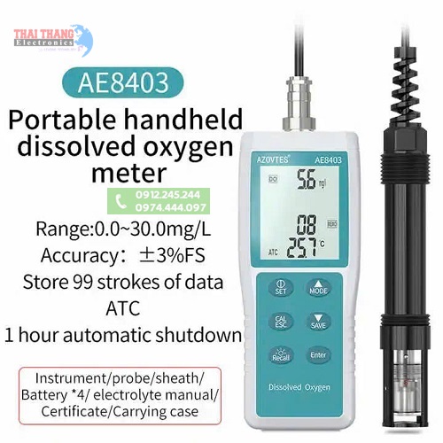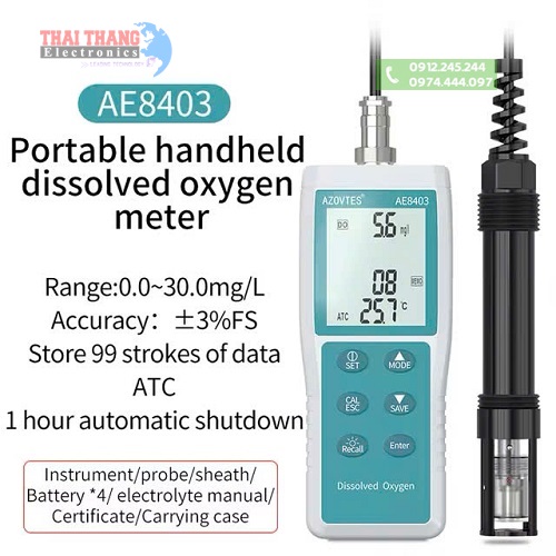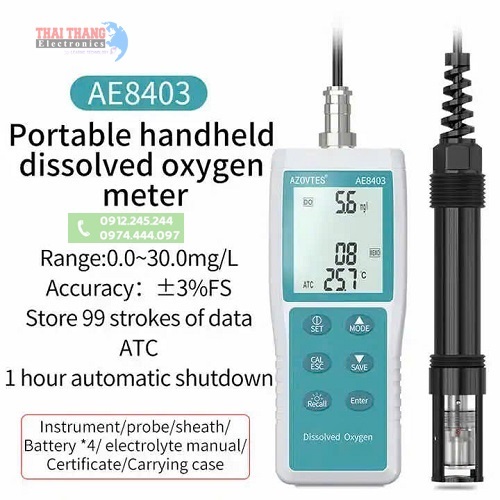 Máy đo oxy trong nước AZOVTES AE8403 Có phạm vi đo oxy hòa tan trong nước ( DO ) 0.0 đến 30.0mg/L,/ 0 đến 199,9% ,thang chia chỉ số nhỏ nhất chỉ 0.1mg/L ,sai số thấp ±3.0%FS,ngoài ra máy được trang bị đi kèm cảm biển nhiệt độ từ 0 đến 50°C và cảm biến độ mặn trong nước từ 0 đến 42 ppt,đo lượng áp suất khí quyển từ 0 đến 3.500m,với độ chính xác cao,thuận tiện sử dụng cho nhiều mục đích khác nhau,chức năng ATC ( bù trừ nhiệt tự động ) giúp đảm bảo kết quả đo ổn định đáng tin cậy trong mọi điều kiện thời tiết.