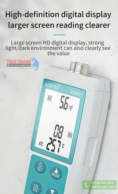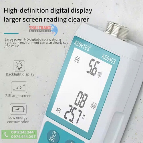 Máy đo nồng độ oxy trong nước AZOVTES AE8403 Thiết kế nhỏ gọn,trong lượng nhẹ chưa tới 200g,thuận tiện mang theo người mọi lúc mọi nơi,với đầu dò cảm biến đi kèm cáp dài 3,5m,dễ dàng đặt hoặc thả vào các vị trí,khu vực môi trường nước cần đo mà không cần phải tiếp xúc trực tiếp bằng tay,để phòng tránh các tác nhân gây hại cho da tay, nguồn sử dụng 4 pin AAA thông dụng dễ dàng thay thế khi hết.