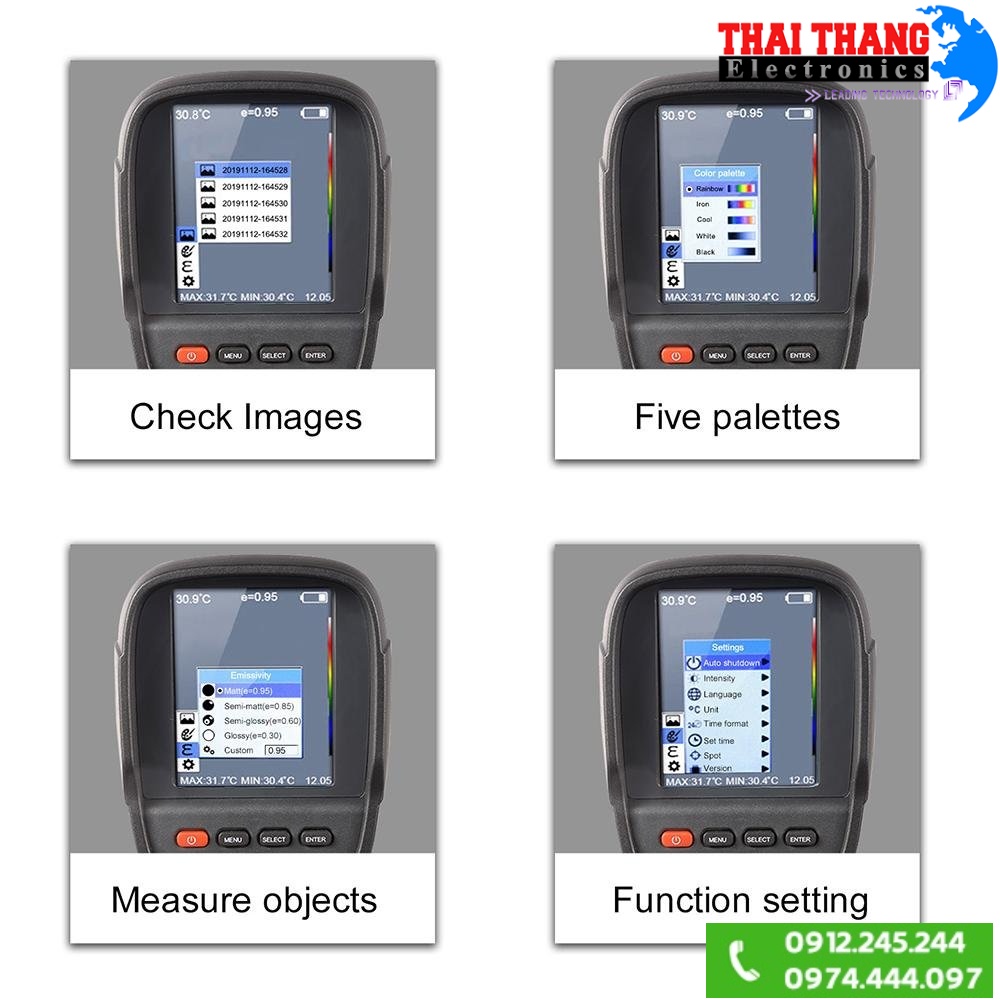Camera ảnh nhiệt cầm tay HT18 có dãy đo trong khoảng từ -20 đến 300°C, sai số chỉ ±2% của kết quả đo, máy sử dụng camera độ phân giải cao cho hình ảnh quan sát vô cùng sắc nét. Máy thể theo dõi thay đổi nhiệt độ trong phạm vi chỉ 0.3°C, chế độ xem vô cùng đa dạng như hiển thị hình ảnh thực tế và hiển thị dạng ảnh nhiệt. Chế độ ảnh nhiệt có thể tùy chọn màu hiển thị gồm màu cầu vồng, oxit sắt đỏ, màu lạnh, đen trắng và trắng đen. Với chế độ ảnh nhiệt người dùng có thể phát hiện các vùng nào trên máy móc bị quá nhiệt một cách dễ dàng và nhanh chóng. Đặc biệt máy có thể cùng lúc theo dõi 3 điểm nhiệt khác nhau gồm điểm nhiệt trung tâm, điểm có nhiệt độ cao nhất và điểm có nhiệt độ thấp nhất. Máy có thể điều chỉnh mức độ phát xạ từ 0.1 đến 10.0 giúp đo được trên nhiều bề mặt vật liệu khác nhau kể cả đo trên cơ thể người. Hình ảnh và thông số đo được sẽ hiển thị trên màn hình LCD kích thước 3.2 inch giúp người dùng dễ dàng quan sát ngay cả trong điều kiện ánh sáng yếu.