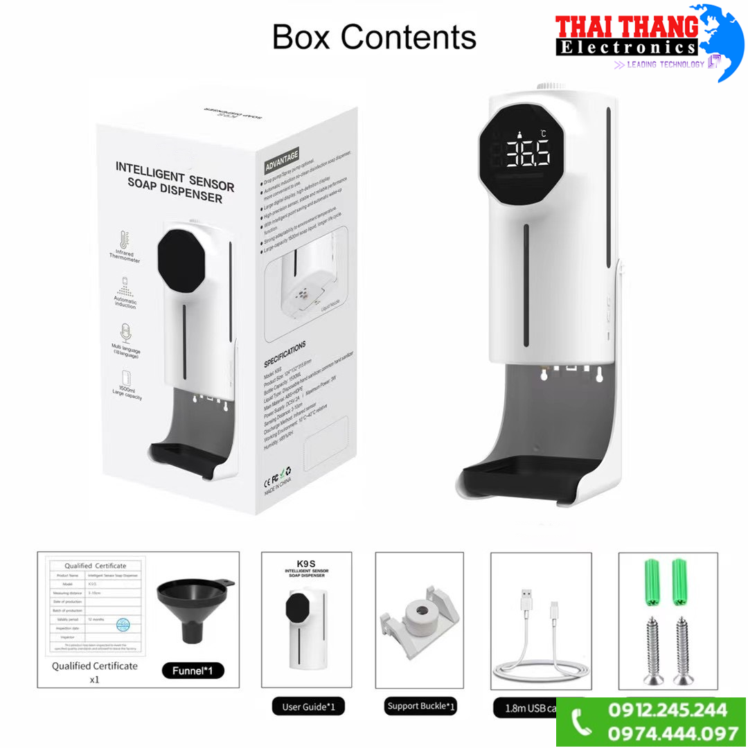 Máy tự động đo nhiệt độ cơ thể K9 pro max có dãy đo từ 0 đến 50°C, hai cảm biến đo trán và tay có độ chính xác vô cùng cao, đồng thời không bị hỏng vặt như các dòng máy trước đây nhờ vào công nghệ đo nhiệt cao cấp của Nhật. Các cảm biến phát hiện chuyển động siêu nhạy cho thời gian hiển thị kết quả nhanh chỉ 0.1 giây. Đặc biệt tính năng cảnh báo khi quá nhiệt bằng tiếng Việt và đèn báo giúp dễ dàng phát hiện tình trạng thân nhiệt cao từ đó đưa ra biện phát xử lý kịp thời, mức nhiệt độ báo động có thể được điều chỉnh thông qua cài đặt trên máy. Sản phẩm được trang bị bình đựng dung dịch có dung tích 1500ML, nhiều hơn hẳn các dòng máy khác cho thời gian xịt lâu dài, lượng dung dịch khi phun có thể được điều chỉnh tùy vào nhu cầu người dùng.