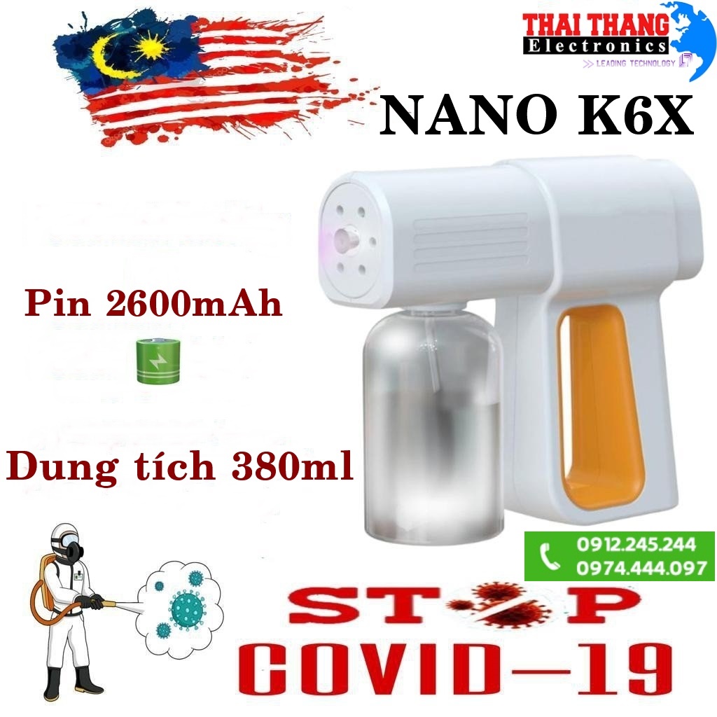 Máy phun khử khuẩn chính hãng Nano K6X sử dụng công nghệ tách phân tử thành các hạt nhỏ đường kính 1µm với khoảng cách phun lên đến 1.5m, khi phun sẽ tạo sương siêu mịn tiết kiệm dung dịch, không cặn. Máy có thể phun trực tiếp trên cơ thể người mà không gây hại đến sức khỏe, hoàn toàn phù hợp với tình hình dịch Covid đang diễn biến phức tạp. Ngoài ra máy có thể phun trực tiếp vào không khí, vải, vật dụng hàng ngày, thiết bị điện tử hoặc xe hơi. Sản phẩm có thể sử dụng như thiết bị tạo ẩm trong nhà, máy xông tinh dầu, máy bổ sung nước, thiết bị tưới cây,…. Đặc biệt